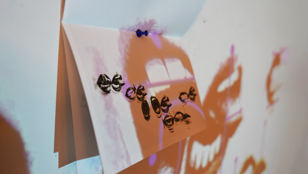 This is a typeface crafted from the shape of the mouth, which was captured. After adjusting the colors to black and white, various hues were experimented with. The numerous letters produced with this typeface convey gentle sentiments of gratitude or love, aiming to visually depict the emotions they evoke. Additionally, words and emotions were projected overlapping onto the booklet to convey the concept further.